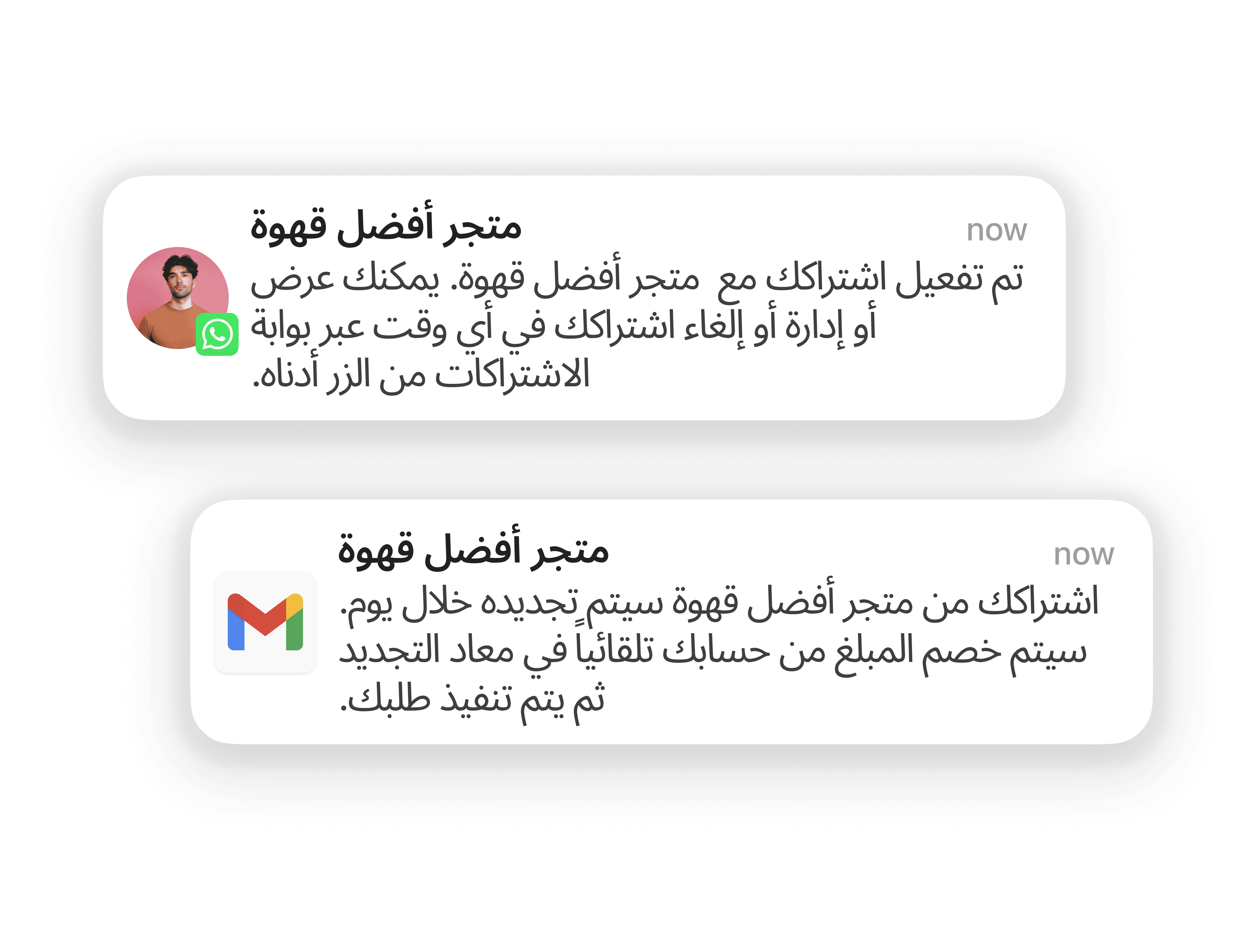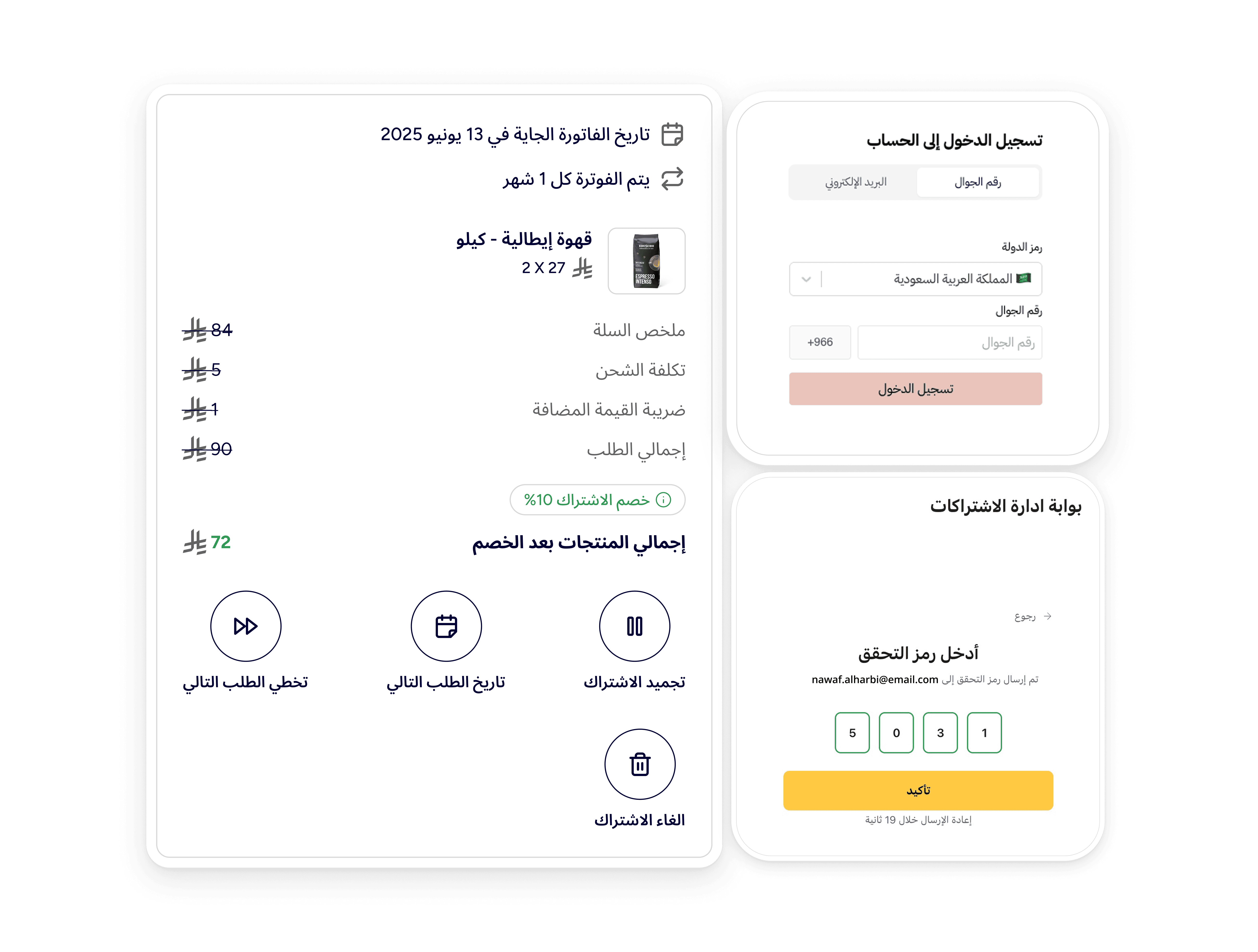 بوابة اشتراكات آمنة مدمجة بمتجرك و مخصوصة لعملائك فقط تسمحلهم بإلغاء اشتراكاتهم أو توقيفها مؤقتاً أو تعديل تاريخ الطلب القادم